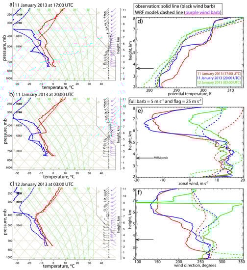 Vertical profile of the upstream atmosphere, at Saratoga, according to radiosonde data (solid lines) and the inner-domain WRF model (dashed lines). The first three panels (a–c) show temperature (red lines) and dewpoint (blue lines) on a skew T diagram, with wind barbs on the side (full barb = 5 m·s−1 and flag = 25 m·s−1), at three different times. Panels (d–f) show the vertical profiles of potential temperature, zonal wind speed, and wind direction, respectively. The height of Medicine Bow Peak is marked by a black arrow in the last three panels.