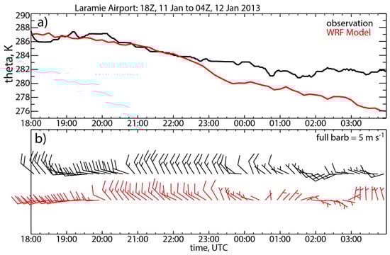 Comparison of surface observations (black) against WRF model (red) for (a) potential temperature and (b) wind. The model is compared against observations from the Laramie Regional Airport weather station during a 10-hour period on 11–12 January 2013.