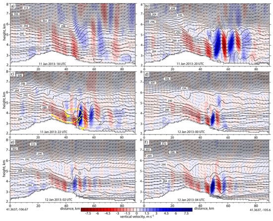 Model vertical cross sections of vertical velocity (color filled), potential temperature (black lines), and wind vectors along the transect line shown in Figure 1, from west to east, at two-hour increments starting in panel (a) at 18:00 UTC on 11 January. Two counter-rotating vortices (yellow dashed lines) are shown schematically in panel (c).