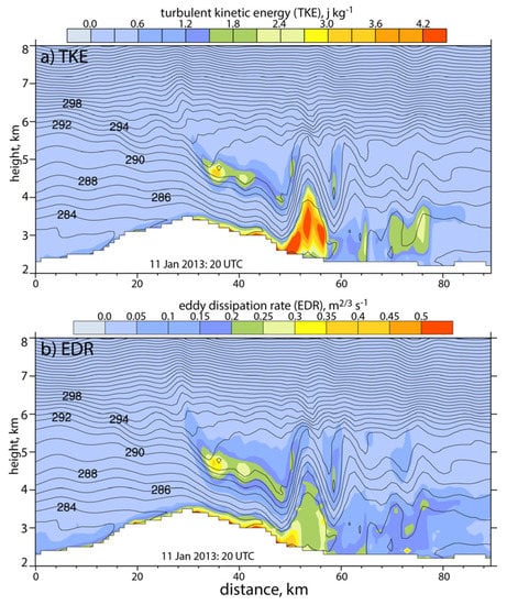 Transects of model turbulent kinetic energy (TKE, m2 s−2) and eddy dissipation rate (EDR, m2/3 s−1) are shown in Figure 7, valid for 20 UTC, a time when the downslope windstorm and hydraulic jump are best developed. We would like to estimate EDR from model output, because EDR is a well-established measure of the subjective feel of turbulence experienced by aircraft passengers. EDR values for specific-size aircraft are linked to turbulence severity categories in pilot reports. There is no physically based relationship between TKE and EDR. Especially for smaller aircraft, EDR values are affected mostly by kinetic energy at the smaller scales of the inertial subrange. Here, the EDR is estimated using an experimental equation (1) proposed in Regmi et al. [] for an aircraft of similar size to the one used in this study: