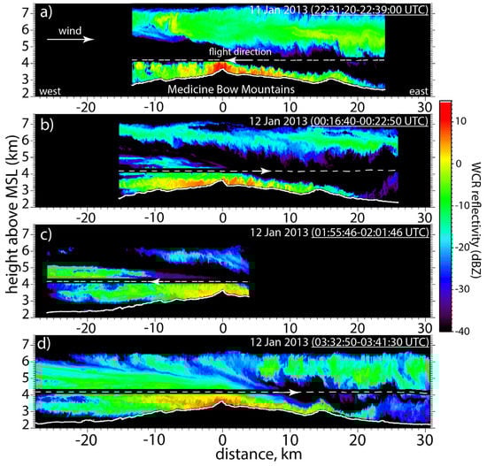 WCR-measured radar reflectivity for the four along-wind transects over the MBM flown over a five-hour period starting, in panel (a), at 22:30 UTC on 11 January 2013. The actual flight times are shown in the plots. The dashed line and arrow in all panels show the flight level and flight direction, respectively. The black belt centered at flight level is the radar blind zone. Distance 0 km in all panels corresponds with the crest of the MBM and the largest distance from panel (d) is kept in all panels.