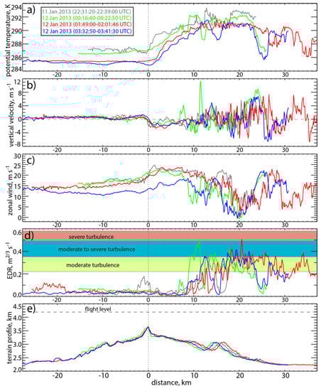 Flight-level atmospheric variables for the same four along-wind flight tracks shown in Figure 8. The vertical dotted line in all panels (x = 0) corresponds with the crest of the MBM. (a) Potential temperature; (b) vertical air velocity (the dashed line represents 0 m·s−1); (c) zonal wind; (d) eddy dissipation rate (EDR) measured by the MacCready turbulence meter, with colored layers indicating turbulence severity based on the classification of Strauss et al. []; and (e) underlying terrain profile (the dashed line in (e) represents the flight level).