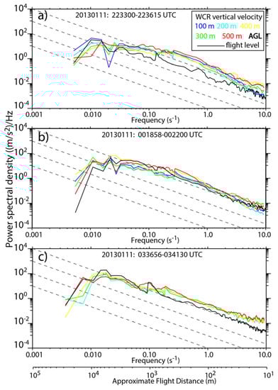 Power spectra of WCR vertical velocity (color lines, representing heights ranging from 100 to 500 m AGL) and flight-level vertical velocity (black line) for along-wind transect (a) #1, (b) #2, and (c) #4. Only the lee-side portion is included, a total distance of ~30 km. Frequency is converted to distance using the average ground-relative speed of the aircraft. The dashed lines show the –5/3 inertial subrange slope at increasing levels of TKE.
