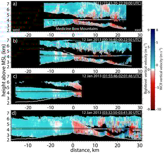 The resulting hydrometeor vertical velocity is the sum of the air vertical velocity and the (negative) hydrometeor fallspeed. The latter is not estimated, but WCR vertical velocity will be displayed using a color scheme centered at –1 m·s−1, such that positive (negative) values can be interpreted as air updrafts (downdrafts). A fallspeed estimate of 1 m·s−1 is reasonable for unrimed snow (e.g., [,]), although it may be high for blowing snow particles []. In any event, the actual fallspeed is small compared to observed WCR vertical velocities in the downslope wind storm and hydraulic jump, as will be shown below.