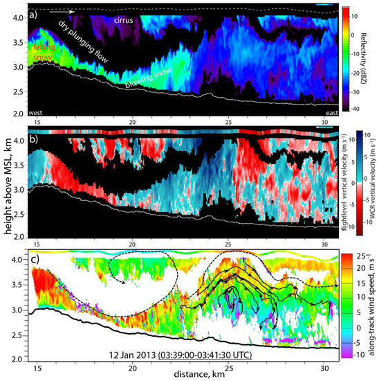 Radial velocities from the two downward-pointing WCR beams, which are ~30° apart, are utilized to obtain the 2D wind field in a quasi-vertical plane below the aircraft. For flight legs that are oriented across the MBM, roughly along the wind, this allows for examination of the downslope wind storm and leeside flow phenomena. Damiani and Haimov [] describe the details of the technique for vertical-plane dual-Doppler synthesis. This technique, used here, has been used in many other WCR-focused studies, including Geerts et al. [,,], Yang and Geerts [], Miao and Geerts [], Sipprell and Geerts [], Damiani et al. [], French et al. [], and Bergmaier and Geerts []. Close alignment of the flight track along the flight-level wind (as is the case in the event examined here) minimizes the difference between the aircraft heading and track angles, a difference that may be large when the cross-track wind is strong. An along-wind flight track ensures close alignment of the nadir and down-forward beams, and reduces the uncertainties in the dual-Doppler synthesis [].