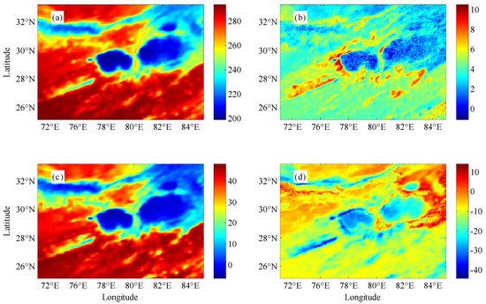 A case of convective cloud on brightness temperature (BT) and brightness temperature difference (BTD) images (/K): (a) infrared brightness temperature (BTIR1) image; (b) BTDIR1–IR2 image; (c) BTDIR1–IR3 image; (d) BTDIR1–IR4 image. The deep blue areas indicate the convection activeties.