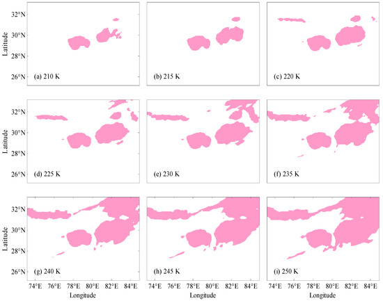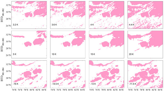 The same method for determining the detection threshold is also used for the BTD images in Figure 3, where three BTD’s detection results vary from four thresholds. As can be seen in Figure 3, it is difficult to distinguish convection from cirrus clouds at any threshold in the BTDIR1–IR2 image. So the BTDIR1–IR2 can be used to eliminate the low and middle cloud at a threshold of about 4 K. The BTDIR1–IR3 image has a similar effect to the BTIR1, and it can eliminate most non-convective areas when the threshold value is set at about 10 K. For the BTDIR1–IR4 image, a better threshold of −16 K was selected because when the threshold varies from −16 to −11 K, the main convection area remains mostly unchanged and the only enlarged area is some cirrus clouds.