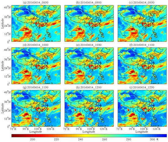 (a–i) FY-2F BTIR1 image at every half hour on 14 June 2016, 08:30–12:30. The image at 10:30 is the object to test our detection process in this paper.