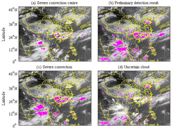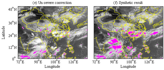 Figure 7a shows that the severe convection centers, which distributed almost in the Meiyu Front Rain Belt and the Bay of Bengal, and some severe convection centers are also located in the southern part of the plateau and the Philippines. Figure 7b shows the preliminary convective cloud detected with the BTIR1 and BTD process. Although mainly convective clouds are included in the result, many cirrus clouds are also included; for example, some ”noise” areas where no convection activities emerge in the summer monsoon cloud system of the Bay of Bengal. Figure 7c shows the severe convection after matching the cloud in Figure 7a,b,d, showing the uncertain cloud, which is widely distributed in the image. The uncertain cloud contains not only the convective cloud but some cirrus clouds such as the small-scale convection in the northwestern Pacific Ocean. The result of the tracking process is displayed in Figure 7e based on the former steps, where some dotted cloud “noises” have been eliminated. Figure 7f is the integrated detection result combining Figure 7c,e, where some isolated cloud clusters are also well detected. On the whole, the integrated detection process has a better performance than any single-threshold method, especially for the isolated convective cloud.