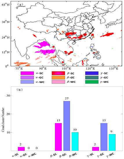 According to the scale and the BTmin of the convective cloud, the detection result is classified and statistically analyzed, as shown in Figure 8. In the classification result, the convection activities are mainly distributed in the mid–low latitude. There is more severe convection in the large cloud belt, while the general and weak convection do not have a distinct tendency in the distribution, for we could see them in any area. In the statistical result, it could be discovered that the total number of β-type cloud clusters is the highest, followed by γ-type cloud clusters. In addition, there are only two α-SC clouds which exist in the summer monsoon cloud system of the Bay of Bengal. Among β-type cloud clusters, general convective cloud clusters have the highest number and the weak convective cloud has the lowest number. In the γ-type cloud, a majority of general convective cloud is also found, but the number of severe convection is lower than that of weak convection, probably due to the fact that the γ-type cloud tends to last for a short time and has difficulty attaining a very high cloud top height.