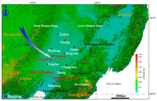 Locations of the two sampling sites and topography of the Northeast China area. The red line from the south to the north indicates rural and urban influence of air quality in Northeast China based on the distribution of population and cites. The blue arrow shows the main wind from northwest China and Mongolia during the sampling period. The T1 and T2 sites are located in a rural influence area.