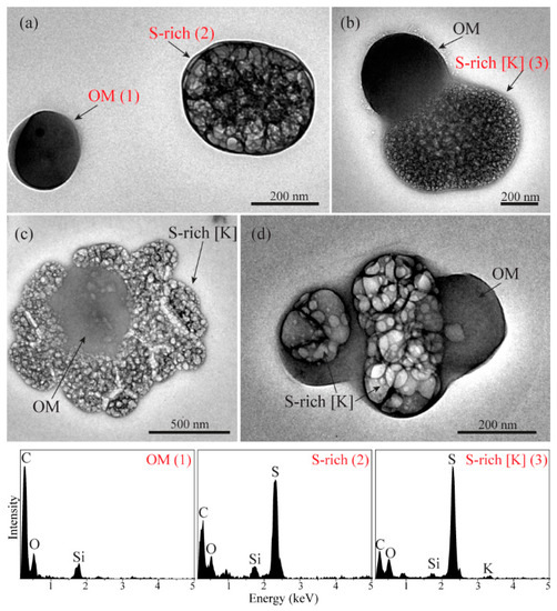 K-rich particles displayed irregular shapes and contained potassium (K), oxygen, sulfur, and/or nitrogen. Once K-rich particles are exposed longer times under the strong electron beam, they can be sublimed. Although the morphology of K-rich particles is similar to S-rich particles, their EDS were different. The EDS of K-rich particles usually displayed high O, K, and/or S (Figure 3a) and S-rich particles displayed high O and S with minor K (Figure 2). The chemical composition of these K-rich particles suggests that they could be KNO3 and/or K2SO4 with minor amounts of KCl. TEM observations showed that most of the K-rich particles were internally mixed with organic, S-rich, and soot particles (Figure 3). In general, K-rich particles can be considered as an important tracer of biomass burning [13,15].