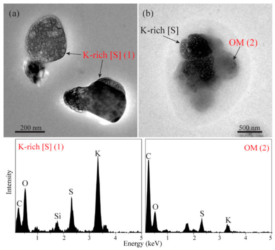 TEM images of K-rich particles. (a) K-rich particles; (b) K-rich particle internally mixed with OM particle. EDS spectra shows the elemental composition of individual particles in red font in TEM images.