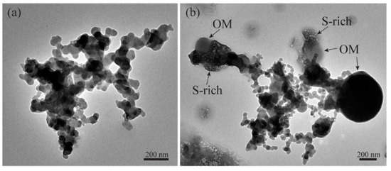 Soot particles, also known as black carbon (BC) or element carbon (EC), are a type of carbonaceous material with graphitic structures, which mainly come from incomplete combustion of fossil fuels and biomass [16,17]. Soot particles exhibit a chain-like aggregation morphology with a diameter of 10 to 100 nm [18]. Most soot particles observed in our study were internally mixed with S-rich and/or OM particles (Figure 4).