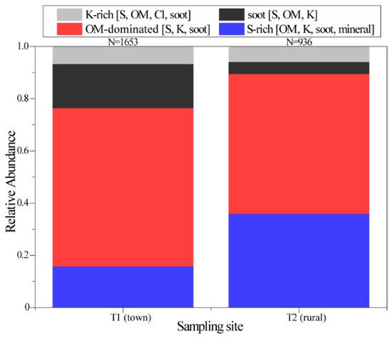 Figure 5 shows that the main aerosols are OM-dominated particles, accounting for 60.7% and 53.5% at the T1 and T2 sites, respectively. The percentage of soot particles was four times higher at the T1 site (16.9%) than at the T2 site (4.6%), and 35.9% of S-rich particles occurred at the T2 site, higher than 15.7% at the T1 site. At the two sampling sites, K-rich particles only accounted for about 6.7% and 6.0% of particles, respectively. It should be noted that most of the OM and S-rich particles (Figure 2) contained minor amounts of K.