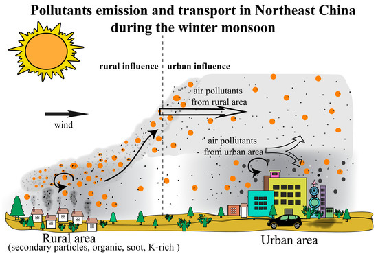 In this study, we focused on sources and the formation of haze particles in a rural influence area of Northeast China (Figure 1). We further integrated our findings and regional air transports in winter in Northeast China. A conceptual model was proposed that can reflect emission and transport of air pollutants from western to eastern parts in Northeast China following the winter monsoon (Figure 8). It is interesting that the conceptual model shows that the anthropogenic pollutants emitted from a rural influence area can be transported and further impact the air quality of an urban influence area in Northeast China. The result is different from the traditional perspective that anthropogenic pollutants in urban areas influence the air quality of rural areas. Therefore, further study is needed to work on the extent to which the air quality of the urban influence areas are impacted through the transportation of pollutants from rural influence areas in winter in Northeast China.