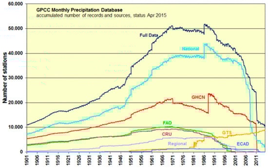 Another way to solve the sampling issues is the combination of GPCC’s precipitation analyses with remote-sensing (i.e., satellite or radar) datasets, which have a near-global coverage, as this is done for example with the GPCP datasets [24,25].
