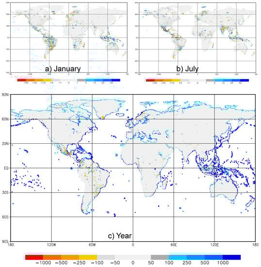 Not surprisingly, the differences between the two releases of the GPCC’s precipitation climatology are largest where significant amounts of station data have been added, as illustrated by Figure 4a–c showing the absolute differences (mm) between the 2015 and 2011 releases of the climatology for January, July, and the entire year. While there are larger, but mostly spotty, differences in the individual months across regions like Brazil, Colombia, Mexico and Indonesia where significant amounts of station data have been added (see Figure 4a,b), the differences over the year are generally small (Figure 4c). Notwithstanding, the annual differences are only significant across Mexico, western Colombia and Indonesia.