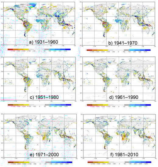 Differences between mean annual precipitation for the different 30-year reference periods (a) 1931–1960; (b) 1941–1970; (c) 1951–1980; (d) 1961–1990; (e) 1971–2000 and (f) 1981–2010 to GPCC’s precipitation climatology 1951–2000 [3].