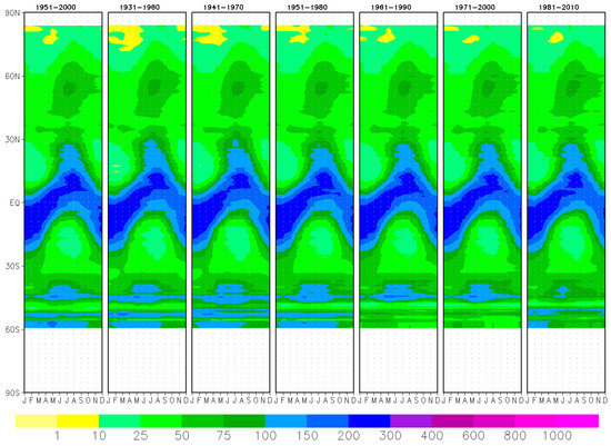 Hovmoeller diagram of zonal mean precipitation (mm/month) over the year for (left) GPCC’s precipitation climatology 1951–2000, and the different 30-year reference periods (second-left to right) 1931–1960, 1941–1970, 1951–1980, 1961–1990, 1971–2000 and 1981–2010.