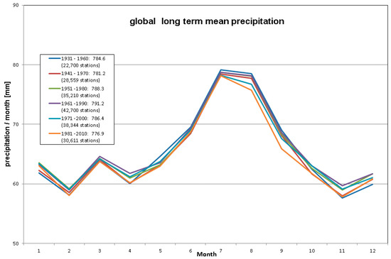 Figure 7 shows the mean annual cycle for the global land surface for the reference periods 1931–1960 to 1981–2010. The mean precipitation varied between 58 and 64 mm per month from January to May, increased up to about 68 mm in June and reached a maximum of 78 to 79 mm in July and August caused by the Asian summer monsoon. Thereafter, the mean precipitation decreased with a minimum of about 58 mm in November.