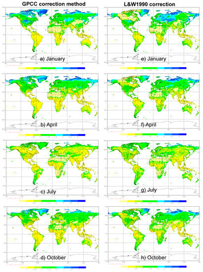 Mean correction factors from (left) GPCC correction method averaged for 1982–2015 for January, April, July and October and (right) Legates and Willmott (L&W1990, [8]) for the same months.