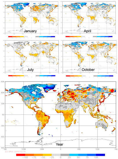 In Figure 9 the absolute differences (in mm) between the GPCC’s correction (according to [6]) averaged for the period 1982–2015 and from L&W1990 are shown for January, April, July and October and for the year. It is obvious that the L&W1990 bulk correction results in too high correction values for Central and Eastern Europe, including the BALTEX area, especially in the northern winter, which is in agreement with the findings for the years 1996 and 1997 [6,7]. L&W1990 also overestimate the gauge-correction in Central and Southern Africa, and over all of South and Central America, including the LBA region throughout the year (also in agreement with [7]). Over Canada, however, L&W1990 has almost no correction and significantly underestimate the systematic gauge-measuring error.