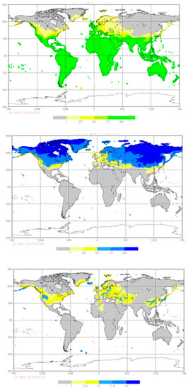 Example of the mean percentage of precipitation phases for January over the period 1982–2015 (top) liquid, (middle) solid and (bottom) mixed phase.