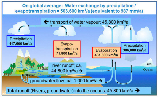 Average water transport/exchanges in km3 per year as derived from GPCC’s precipitation climatology for 1951–2000 land surface precipitation, numbers for precipitation over oceans, evapotranspiration/evaporation over land/ocean taken from [13,14], background picture by courtesy of A. Kapala (Meteorological Institute, University Bonn).