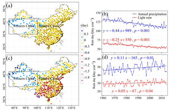 Spatial and temporal trends in annual precipitation days and light rain days for the warm season from 1960 to 2014 over China and the sub-regions (western and eastern China). (a) The spatial distribution of trends for annual precipitation days; (b) temporal trends for annual precipitation days and light rain days over eastern China; (c) the spatial distribution of trends for light rain days; and (d) temporal trends for annual precipitation days and light rain days over western China. Black dots at stations represent significance at the 0.05 level.