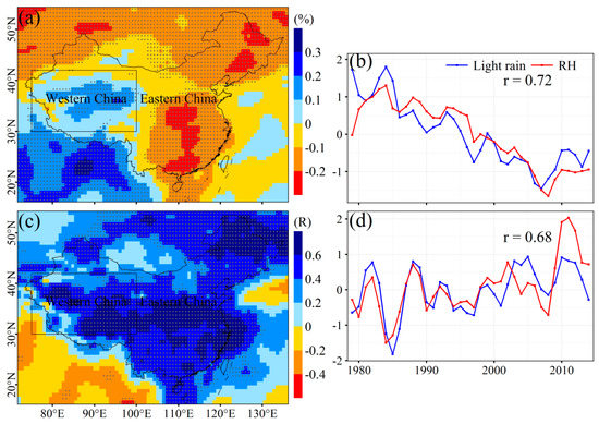 To compare ERA-Interim data, station data for light rain days were interpolated to match the grids of ERA-Interim data. A correlation analysis was then undertaken in order to examine the relationship between light rain days and RH. RH was determined to be positively correlated with light rain days in eastern China, with a correlation coefficient of 0.72 (p < 0.05). The correlation was 0.68 (p < 0.05) for western China. Furthermore, there were similar changes among RH and light rain days (Figure 2b,d). The analysis results indicated a close relationship between RH and light rain days.