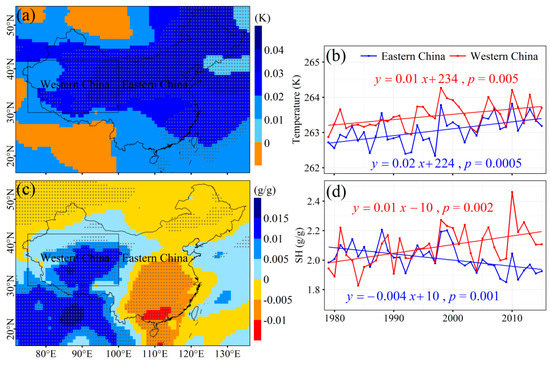 Spatial and temporal trends in lower-tropospheric temperature and specific humidity (SH) from 1960 to 2014 over China and the two sub-regions (western and eastern China). (a) The spatial distribution for trends in temperature; (b) temporal trends in temperature over western and eastern China; (c) the spatial distribution for the trend in SH; and (d) temporal trends for SH over western and eastern China. Black dots in the pixels represent significance at the 0.05 level.