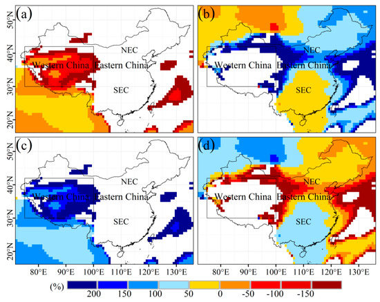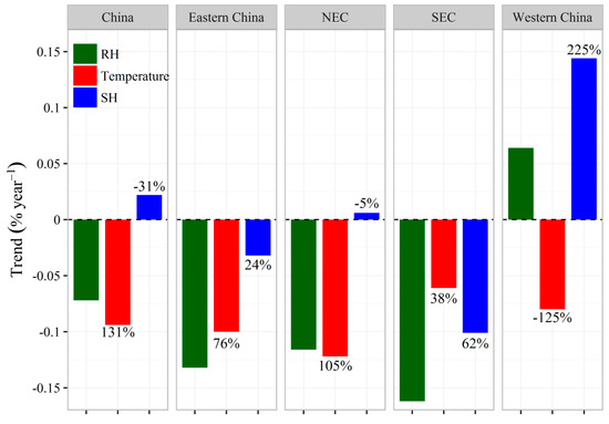 As shown in Figure 5c, an increase in RH largely occurred over western China. All of the contributions from SH over regions with an increase in RH were more than 50%. The mean contribution of temperature was −125%. The SH contribution was 225%. The SH contribution indicated that the increase in SH eliminated the counterproductive effect from increased lower-tropospheric temperature and resulted in a net increase in RH over western China (Figure 6). Over SEC, a decline in RH was primarily attributed to a decrease in SH with a contribution of 62%.