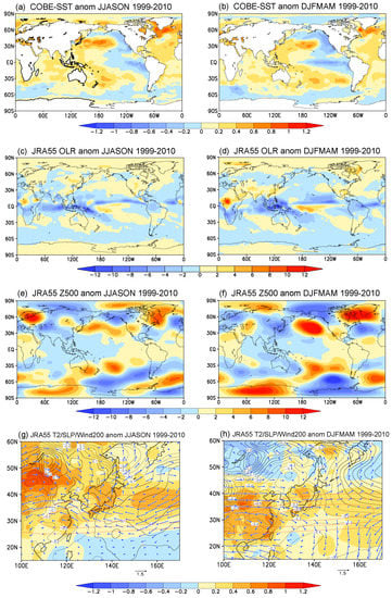 Observed anomalies averaged from 1999 to 2010 for DJFMAM (left) and JJASON (right). (a,b) sea surface temperature (SST) (K), (c,d) outgoing longwave radiation (OLR) (W/m2), (e,f) Z500 (m, zonal mean is removed), (g,h) surface air temperature (shading, K), sea level pressure (SLP; contours, hPa), and 200 hPa wind velocity (arrows, m/s). Red contours in (g,h) show 50, 60, and 70 m/s of climatological westerly as a reference of a mean position of the Asian Jet. Sea surface temperature (SST) is based on COBE-SST, and atmospheric variables are from JRA-55 reanalysis.
