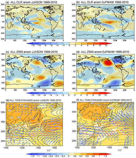 One hundred-member ensemble-mean anomalies of the all-forcing (ALL) run averaged from 1999 to 2010 for JJASON (left) and DJFMAM (right). (a,b) OLR (W/m2), (c,d) Z500 (m, zonal mean is removed), (e,f) surface air temperature (shading, K), SLP (contours, hPa), and 200 hPa wind velocity (arrows, m/s). In (a–d), dotted areas show values exceeding the 99% confidence level. In (e,f), red contours show 50, 60, and 70 m/s of climatological westerly as a reference of a mean position of the Asian Jet, and gray contours show the 99% confidence level of SLP. Values exceeding the 99% confidence level are shown for surface air temperature and 200 hPa wind anomalies.