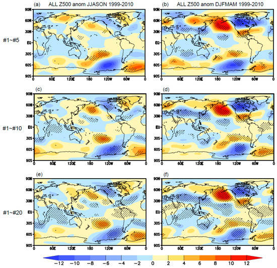 Z500 anomalies of the ALL run (m, zonal mean is removed) averaged from 1999 to 2010 for JJASON (left) and DJFMAM (right). Ensemble average is calculated for randomly-chosen 5 members (a,b), 10 members (c,d), and 20 members (e,f). Dotted areas show values exceeding the 99% confidence level.