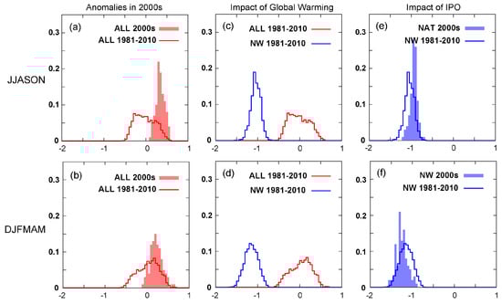 We compared histograms of 12-year mean temperatures after 1999 to every 12-year window in the reference period (1981–2010) using the ALL run (Figure 5a,b) and found that warm anomalies in Japan became more frequent after 1999, both in JJASON and in DJFMAM. Again, this reflects both anthropogenic climate change and natural variability in boundary forcing. To isolate the effects of anthropogenic warming, we compared histograms of 12-year-mean temperature data from the ALL run and NW run (Figure 5c,d) and found that there is no doubt about the impacts of anthropogenic climate change on the increase in warm periods over Japan both in JJASON and in DJFMAM. The impact of decadal natural variability was examined using the NW run by comparing post-1999 anomalies with anomalies during the reference period (Figure 5e,f). The results showed that in comparison with the reference period, warmer (colder) periods in JJASON (DJFMAM) become more frequent after 1999, which is consistent with the increasing seasonal temperature contrast.