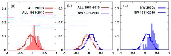 To more precisely quantify the impacts of each factor on decadal-scale seasonal temperature contrast in Japan, we compared the differences in anomalous temperature between JJASON and DJFMAM (Figure 6). The ALL run showed that the differences were significantly more frequent after 1999 than they were over the whole reference period (Figure 6a). This positive shift can be attributed mainly to decadal natural variability (i.e., La Nina-like conditions during this period; Figure 6c). On the other hand, comparison between the ALL and NW run (Figure 6b) indicated a slightly negative shift of the distribution (reducing seasonal differences) due to anthropogenic global warming (Figure 6b).