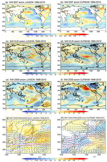 In observed SST anomalies of JJASON and DJFMAM averaged from 1999 to 2010, La Nina-like conditions were observed in the tropical Pacific, while warm anomalies were distributed east of Japan (Figure 2a,b). This pattern is typical of a negative phase of IPO. Here, the global warming trends relative to the reference period (1981–2010) are included in Figure 2. Associated with the La Nina-like SST anomalies, negative outgoing longwave radiation (OLR) anomalies were visible in the western Pacific (Figure 2c,d), indicating enhancement of convection over the Maritime Continent and Walker circulation in both seasons. The enhanced convective activity in the western equatorial Pacific was the source of a Rossby wave-like train on a decadal timescale, especially from December to May. The wave pattern was observed in 500 hPa geopotential height (Z500) anomalies (Figure 2f). It made barotropic cyclonic anomaly (negative Z500 and sea level pressure (SLP) anomalies in Figure 2f,h) from eastern Eurasia to Japan, which brought colder air in DJFMAM in Japan [1]. In contrast, from June to November, zonally elongated positive anomalies were visible from East Asia to North America (Figure 2e), and were also related to active convection in the western tropical Pacific [1]. The positive Z500 anomalies over Japan corresponded to a northward shift of the Asian Jet and the enhanced Pacific High (200-hPa wind velocity and SLP anomalies in Figure 2g), and resulted in higher temperatures. Relatively, the cyclonic anomaly in DJFMAM suppressed recent warming and the anticyclonic anomaly in JJASON enhanced warming, resulting in an increase in seasonal contrast in the early 21st century around Japan. Here, the 3-month mean anomalies of JJA and SON (DJF and MAM) were relatively similar to JJASON (DJFMAM) and contributed to the results in Figure 2 (not shown).