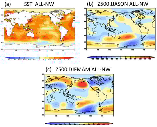 We also considered the role of global warming in seasonal temperature differences over East Asia. The differences in annual mean SST between the ALL and NW runs, which corresponds to the defined global warming trend that was excluded from the NW run, showed that warming was faster in the Atlantic and Indian Oceans than in the Pacific Ocean (Figure 8a), and that warming was also faster around Japan. In the tropical Pacific Ocean, warming was faster in the west than in the east, which increased the mean zonal SST gradient. Here, seasonal differences in the ALL minus NW SST patterns were not apparent because we defined the global warming trend using annual mean SST. However, maps of Z500 responding to the boundary condition changes showed seasonal differences (Figure 8b,c), with positive Z500 anomalies occurring around Japan in DJFMAM, but with unclear changes in JJASON. This resulted in faster warming in DJFMAM than in JJASON, consistent with the smaller seasonal temperature contrast in Japan in the ALL run compared to the NW run (Figure 6b). This result is also consistent with the change tendency obtained from future projections of CMIP5 models [16].