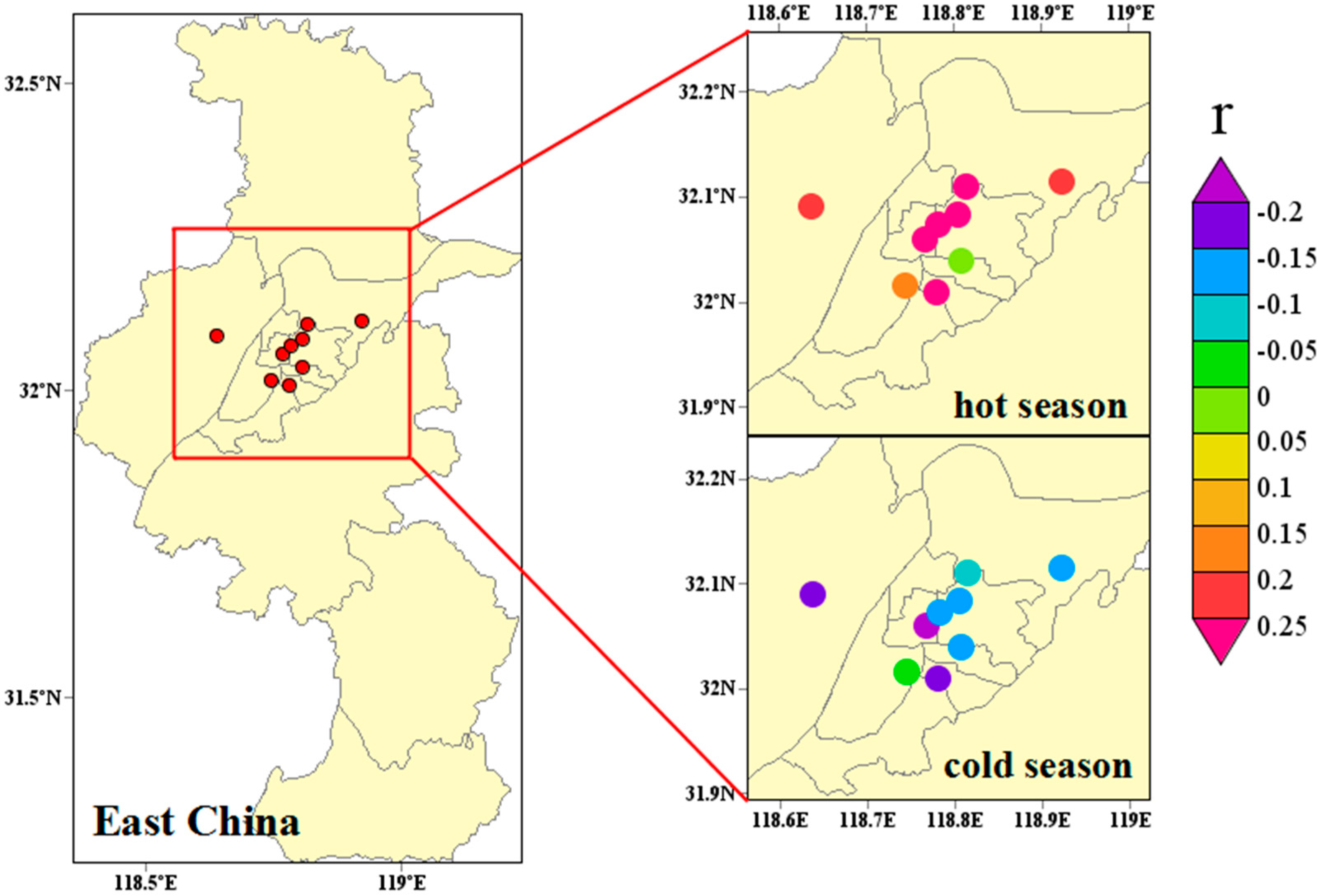 The geographic locations of 9 state controlling air sampling sites in the urban area of Nanjing in East China (left panel) with the correlation coefficients between ambient fine particles (PM2.5) and ozone (O3) in hot and cold seasons in the urban area of Nanjing over 2013–2015 (right panel).