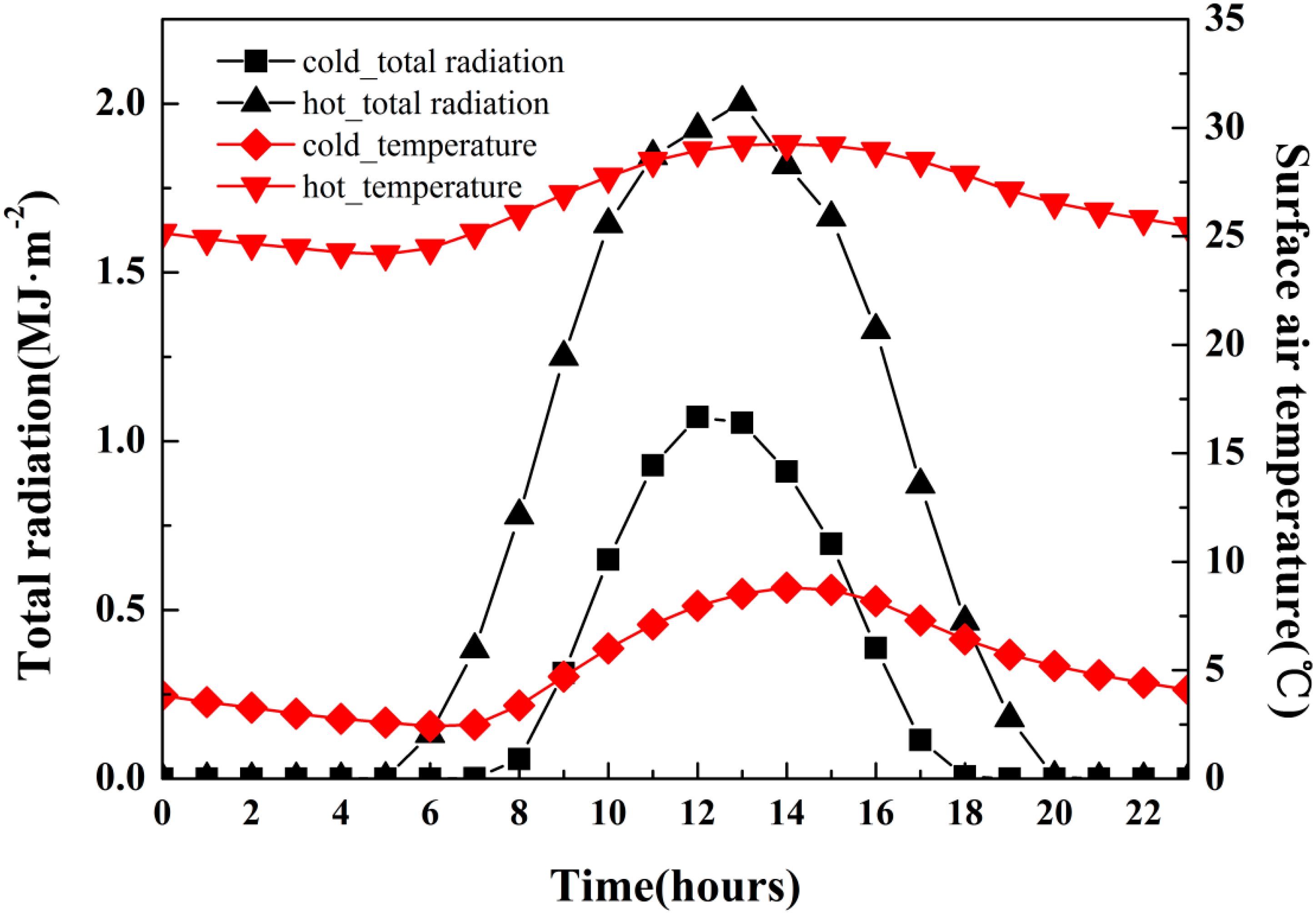 Diurnal changes of surface air temperature (°C) and total radiation (MJ·m−2) in the local time in Nanjing averaged in cold and hot seasons over 2013–2015.