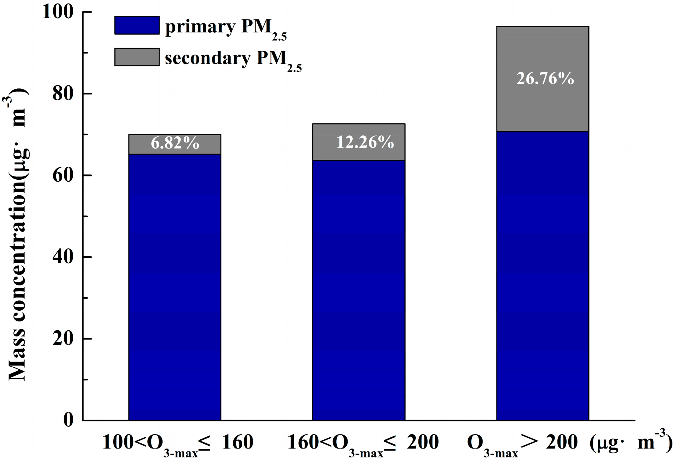The contributions of secondary PM2.5 particles to ambient PM2.5 concentrations under photochemical activities ranged with 100 μg·m−3 < O3-max ≤ 160 μg·m−3, 160 μg·m−3 < O3-max ≤ 200 μg·m−3, and O3-max > 200 μg·m−3 estimated from the three-year environmental observation in the urban area of Nanjing.