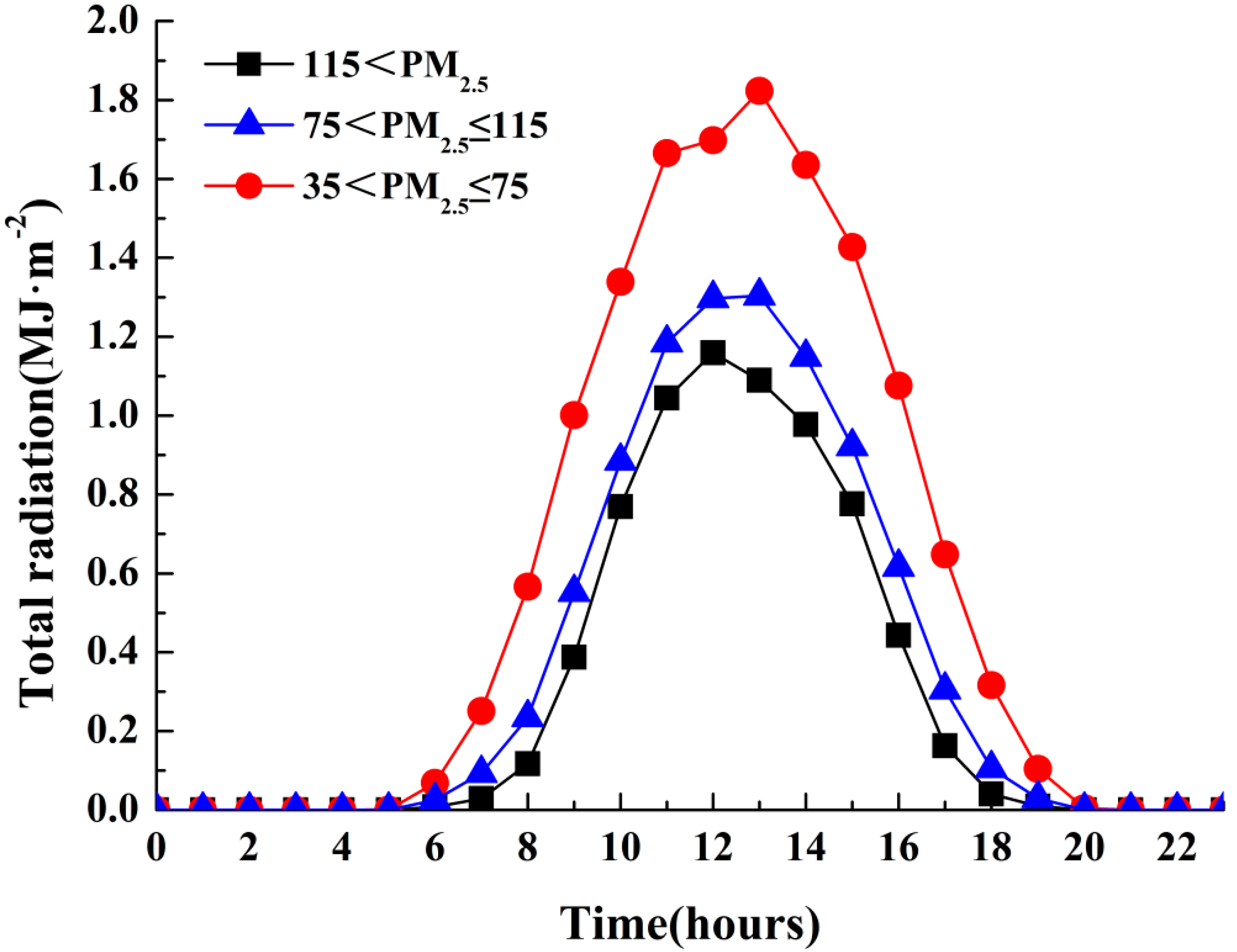 Diurnal changes of total radiation in local time under three PM2.5 levels over 35–75 μg·m−3 and 75–115 μg·m−3 as well as exceeding 115 μg·m−3 during 2013–2015 in Nanjing.