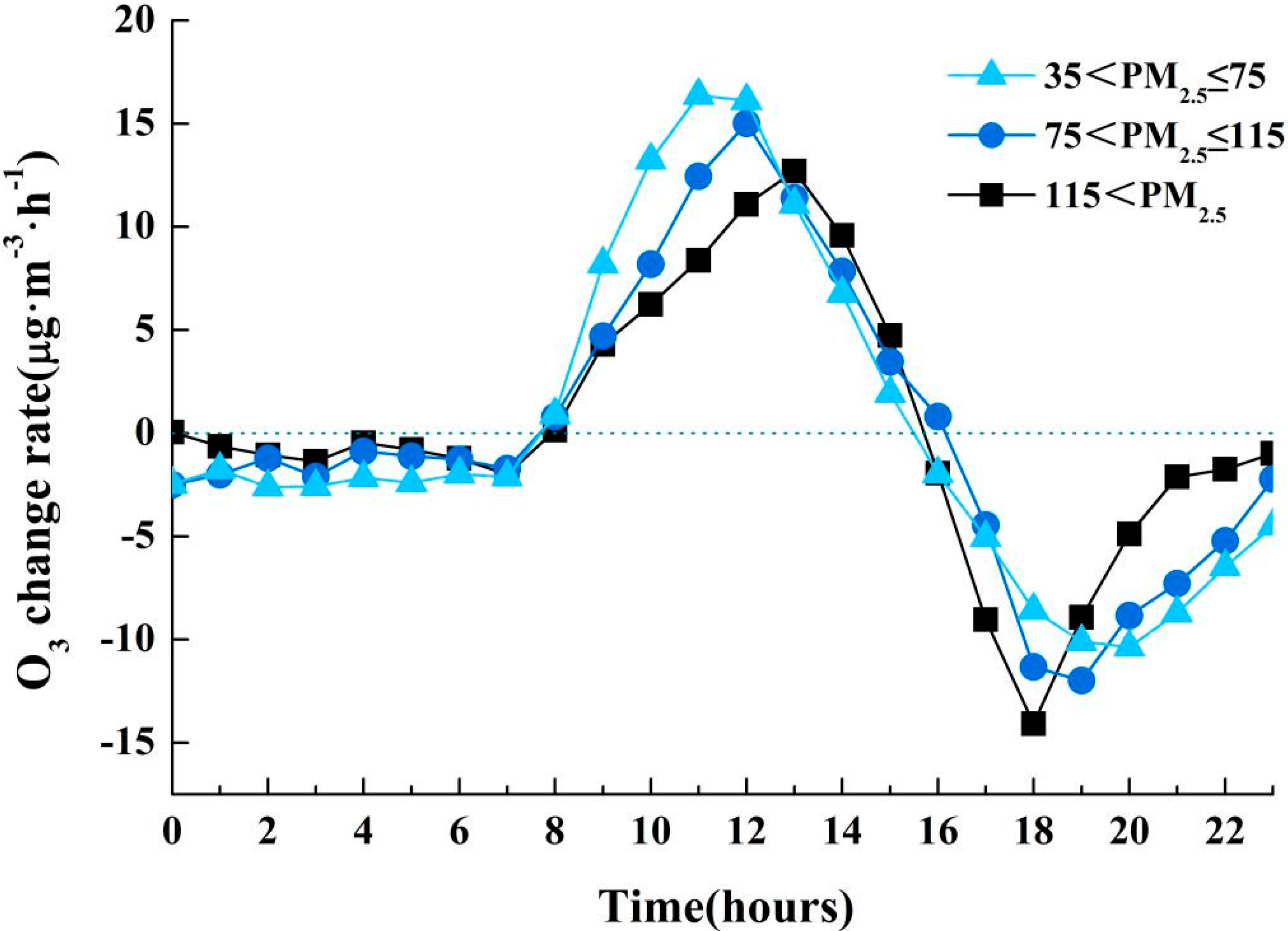 Diurnal distribution in local time of O3 change rates under three PM2.5 levels over 35−75 μg·m−3 and 75–115 μg·m−3 as well as exceeding 115 μg·m−3 during 2013–2015 in Nanjing.