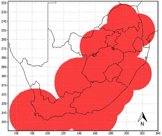 The areas of South Africa covered by radar systems (red) when all radars are operational.