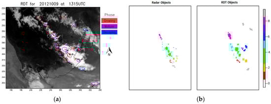 The RDT algorithm is an object-orientated methodology to identify and track thunderstorms by means of polygons for different phases of the convective storms—triggering, growing, and mature. To validate these objects against radar reflectivity requires an object-orientated methodology, which was also followed by the developers []. An overview of the research done on spatial validation methodology is provided by []. Object-based approaches identify different attributes (such as position and size) to each individual pair of forecast/observed “objects” []. The methodology behind object-orientated methods forms part of the statistical software package called SpatialVx [] as part of the “R” programming language []. Figure 2 shows an example of how the SpatialVx software [] transforms features of the RDT and radar over the study domain into objects and matches these objects. Figure 2a shows the RDT overlaid on satellite imagery for 9 October 2012 at 1315 UTC. Figure 2b shows how the SpatialVx software transforms these RDT polygons into objects (Figure 2b-right), transforms radar data into objects (Figure 2b-left), and then matches these RDT and radar objects as indicated by the corresponding colors.