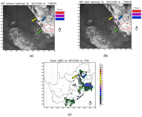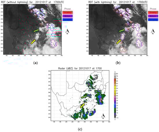 In Figure 5 the RDT without (a) and with (b) lightning data included into the input dataset at 1700 UTC on 17 October 2012 is shown. Radar reflectivity for the same time is also shown (c). A few additional storms were detected when lightning data were included (b). The storms indicated by the green and yellow arrows were not identified by RDT without lightning data included in the input, but were identified when lightning data were used as input. The radar image indicates that intense (>50 dBZ) storms did occur over these areas. Another difference between the RDT images is that the phase of some of the storms changed when lightning data were included. A few storms that were classified as decaying were classified as mature storms with the inclusion of lightning data. An average of all the time steps for this case indicates that the POD improved significantly by 21% from 0.57 to 0.78 when lightning data were added. The FAR was 2% better (0.07 compared to 0.09) and the HSS was 16% higher (0.84 compared to 0.68).