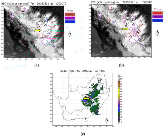 Figure 4 shows the RDT without lightning (a), RDT with lightning included (b), and radar reflectivity (c) for 1300 UTC on 21 March 2015. Additional storms were again identified when lightning data were included in the input, and some of the phases of the storms changed. An intense storm (>50 dBZ) over the central parts of the country, as indicated by the yellow arrow, was identified when lightning data was included. The average of all time steps for this day shows that the POD score improved by 5% (from 0.76 to 0.81), the FAR increased slightly (from 0.062 to 0.067), and the HSS improved by 2% (from 0.83 to 0.85) when lightning data was added to the software.
