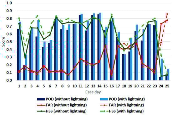 Probability of detection (POD), false alarm ratio (FAR), and Heidke skill score (HSS) for 25 cases without lightning data included (darker colors and solid lines) and with lightning data included (lighter colors and dashed lines).